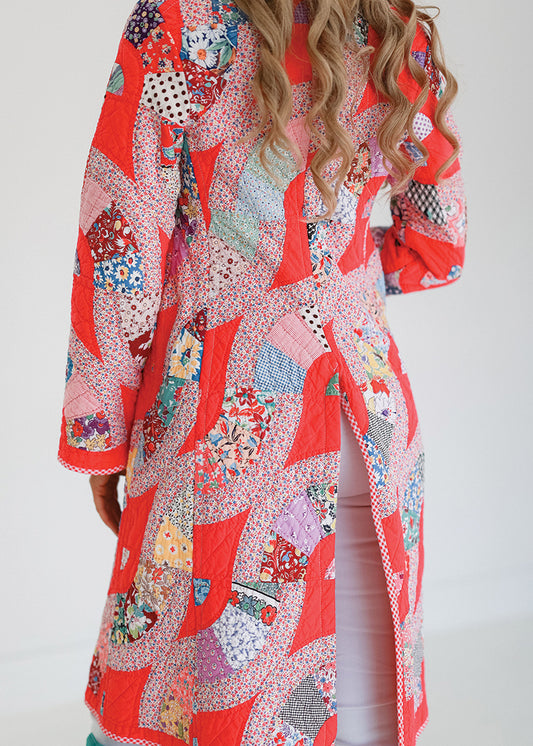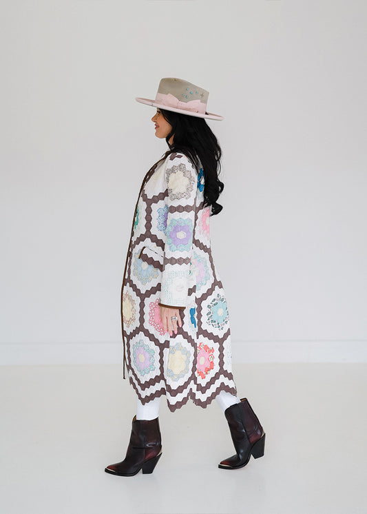 One of my greatest joys in this life is the gift of giving gifts; what better way to express my love for others by wrapping them in beauty and the love and care that the women who made the quilts put into them. By making these upcycled garments and giving them to others, we get to re animate these quilts, giving them a second life, when they otherwise could’ve been locked in a drawer or stored away in some dusty attic. I feel like this new form for these fabrics honors the women who made them and the love, unending love they had for their families. Many of them used whatever remnants they had from feedsacks to old suiting or dress fabrics to make these quilts that provided necessary warmth for their families. I am so moved by the time, love and warmth these creations have provided, and I just know that they have to live on, not forgotten in storage.